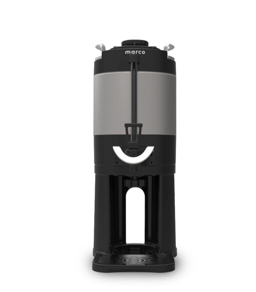 يوضع ترمس URN اسفل اداة ماركو جيت 6 ليتم تحضير القهوة مباشرة من السلة الى ترمس التحضير بكل انسيابية،