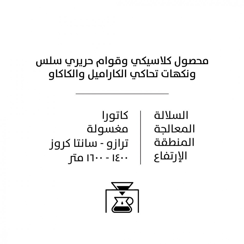 محصول كلاسيكي وقوام حريري سلس ونكهات تحاكي الكاراميل والكاكاوالسلالة : كاتورا ;المعالجة : مغسولة ;المنطقة : ترازو - سانتا كروز ;الإرتفاع : 1400 - 1600 متر ;